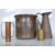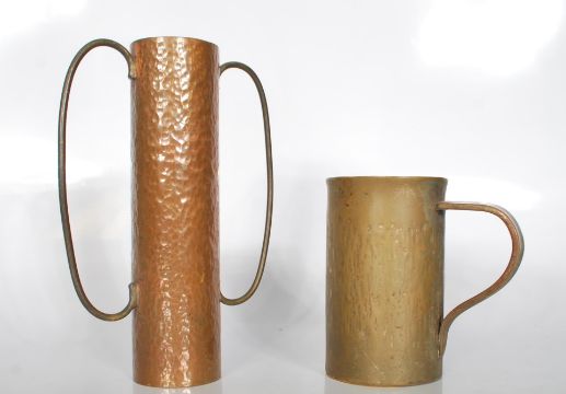 A selection of Arts and Crafts early 20th Century copper wares to include a Joseph Sankey & Sons pitcher of tapering form having repousse crocodile skin decoration, a Joseph Sankey & Sons planter having repousse floral decoration, and two small copper / brass vessels. Measures 28 cm high.
