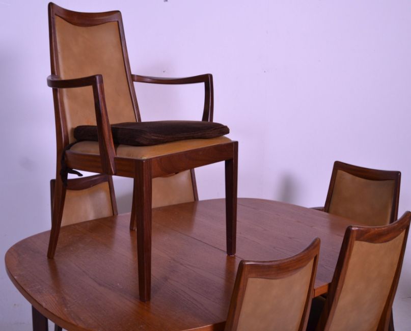 A vintage retro G Plan 1970's dining suite to include a teak extending dining table, the table top of ovular form raised on ovular legs together with G-Plan teak wood dining chairs having tan leather upholstered seats with tapering from rectangular backrests raised on block legs to include two carvers (one with a broken arm rest) and four dining chairs. Measures 82cm high  x  36cm wide  x  40cm deep.