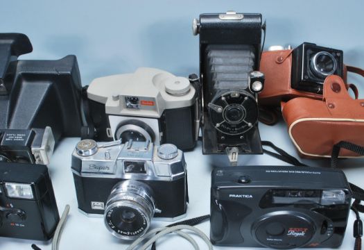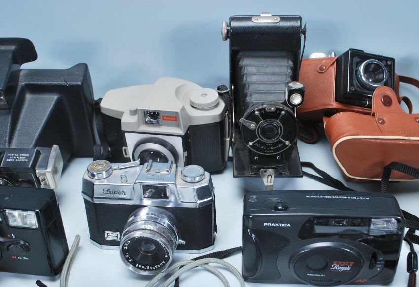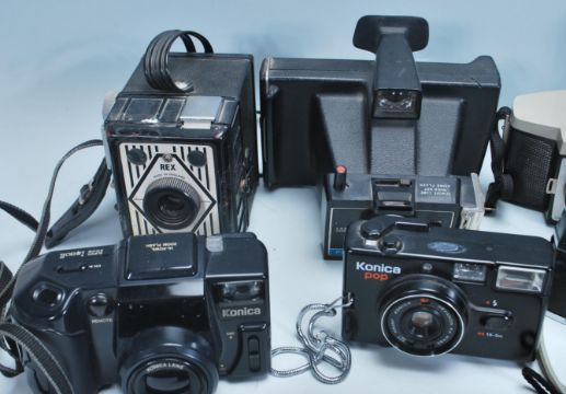A large collection of 20th century vintage 35mm photography cameras to include: Halina 35X Super, Konica Super Zoom Z-up80RC, Halina MW35E, Kodak Cresta 3, Konica Pop, Polaroid Colorpack 2, Polaroid Sprint, Kodak Disk 6000, Goldine Big Finder, Fujifilm A310, Fujifilm Nexia Q1, Kodak Brownie Flash II, Rex Camera, Panorama Wide Pic, Praktica Sport Royal, Samsung PL50.