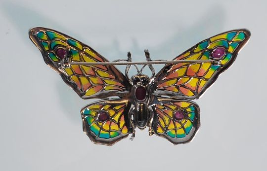 A ladies large silver and plique a jour brooch in the shape of a butterfly. Enamel in blue, yellow and orange. Silver is stamped 925 on the left wing. The body is set with marcasites and pink tourmaline. Measures: 4.6 x 7.7 cm. Weight: 18.6g.