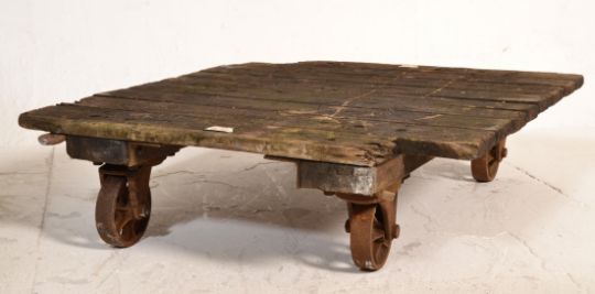 A 19th century Industrial cast iron and wooden dram trolley / factory trolley. Raised on cast iron castors with metal frame supporting planked wooden top. Original makers label Slingsby ' Sliding Wheel ' of Bradford, Belfast, Glasgow, Newcastle & Bristol