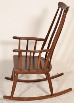 A 20th Century Danish retro vintage dark stained teak wood rocking chair having a tall backrest with shaped top rail, shaped arm rests, later panelled seat and raised on sleigh runners. Measures 106 cm high  x  58 cm wide  x  80 cm deep.