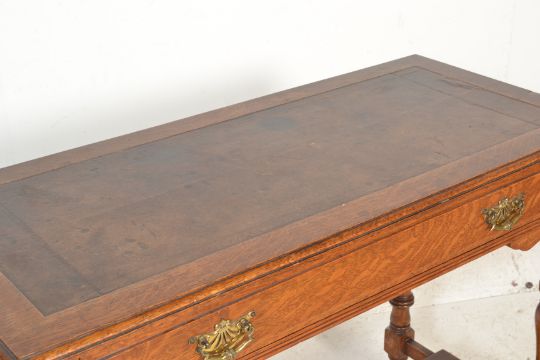 A good Victorian 19th century oak and leather writing table desk. Raised on turned legs with castors having lower tier uniting. Above having a fitted frieze with single drawer and leather tooled inset desk top above.  Measures 75cm high by 100cm wide by 45cm deep.