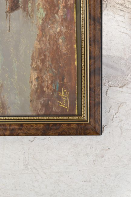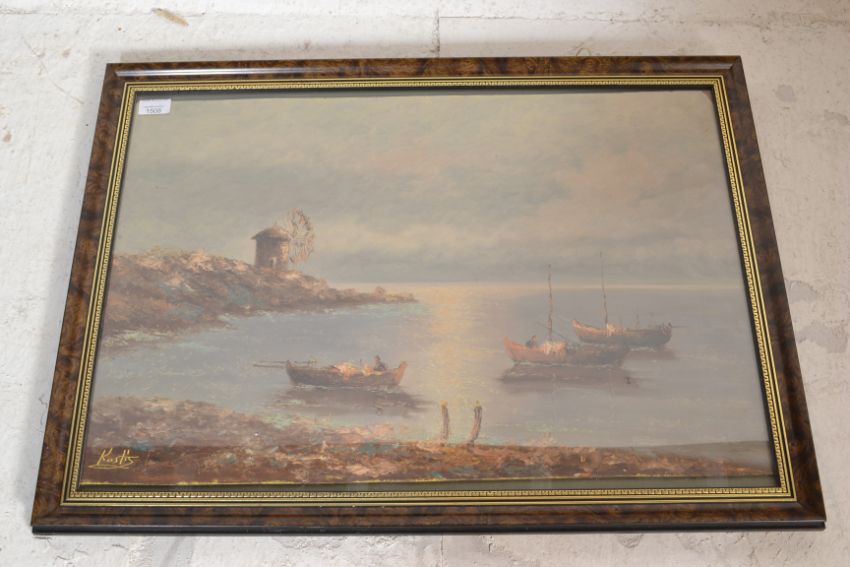 A 20th Century acrylic on paper painting depicting a Greek seaside scene with moored boats and a windmill to the shore. Signed Kostis to lower left corner. Framed.