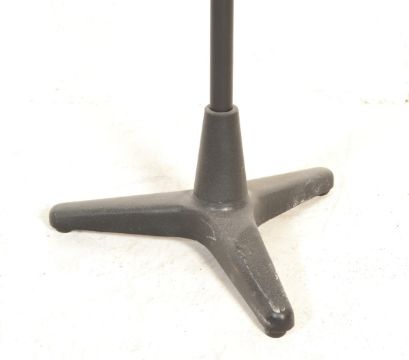A vintage 20th Century adjustable mic stand in the manner of Valour Atlas, black upright column raised on cast metal tripod support.
