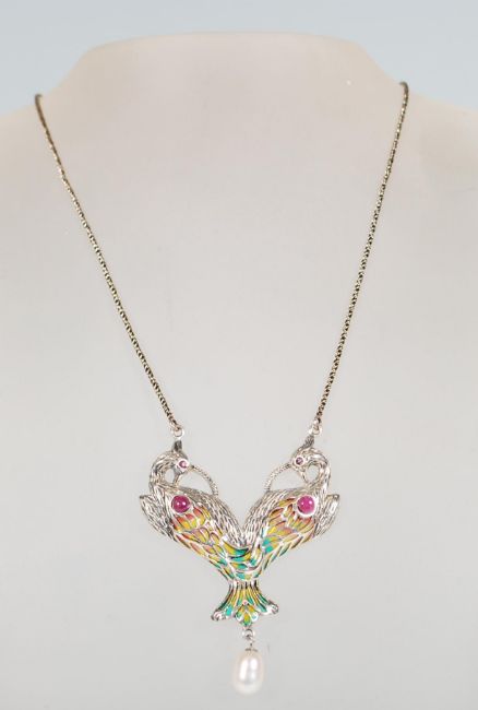 A silver and plique a jour Renaissance style pendant necklace as two doves set with red stone cabochons and a single pearl droplet on a silver chain. Gross weight 16.1g.