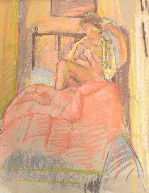 A group of six mid 20th Century pastel nudes depicting ladies in various positions and surroundings. Three studying the same lady. All unsigned. Biggest measures 63cm long by 49cm wide.