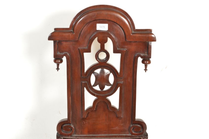 A 19th Century Victorian mahogany hall chair, with pierced back and scrolling decoration, raised on turned supports. Measures 90 cm high x 46 cm wide x 50 cm deep.