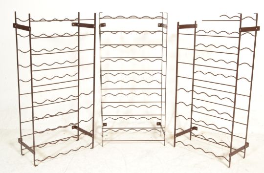 A collection of 3 20th century strapwork metal wine racks. Each rack in original burgandy paintwork having multiple shelves.  Measures 102cm high by 50cm wide by 25cm deep.
