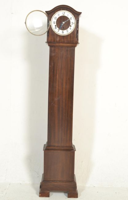 An early 20th century mahogany granddaughter clock with silvered circular dial, Arabic chapter ring, the case raised on plinth base. Measures 142cm high by 25cm wide by 18cm deep.