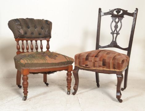 A 19th Century Victorian walnut framed nursing chair, button back backrest over galley turned spindles with embroidered overstuffed seat pad raised on turned supports terminating on ceramic castors together with an Edwardian example. Tallest measures 82cm by 46cm by 45cm.