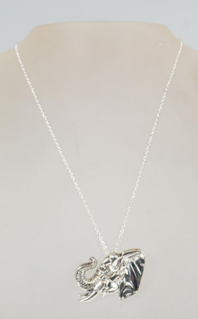 A sterling silver pendant necklace in the form of an elephants head on a silver chain. Weighs 13.1g. Chain measures 18 inches long.