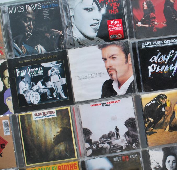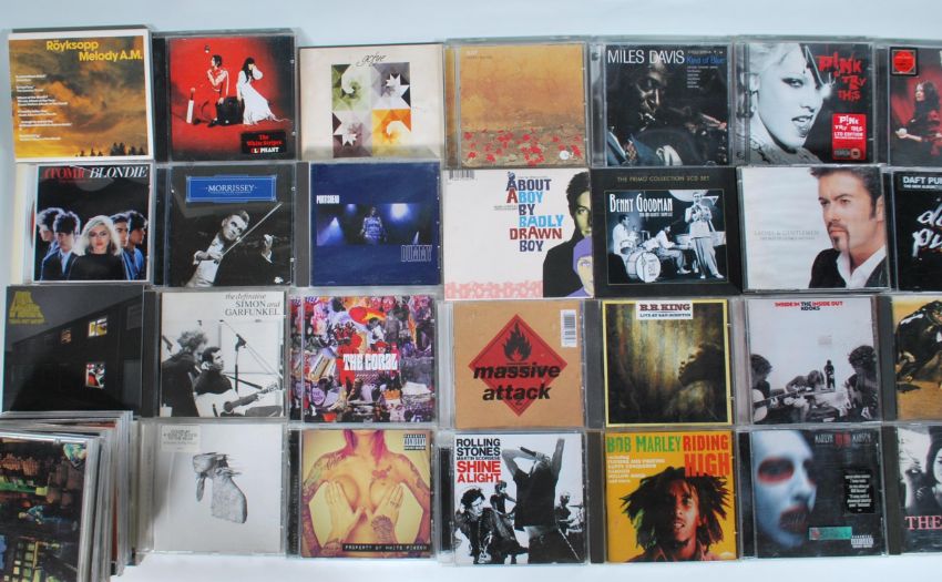 A collection of music compact discs featuring various artists to include The White Stripes, Miles Davis, Blur, Daft Punk, The Kooks, BB King, Massive Attack, Bob Marley, Portishead, The Clash, Queen, Nirvana, Arctic Monkees, The Pixies, Blondie, Janis Joplin etc.