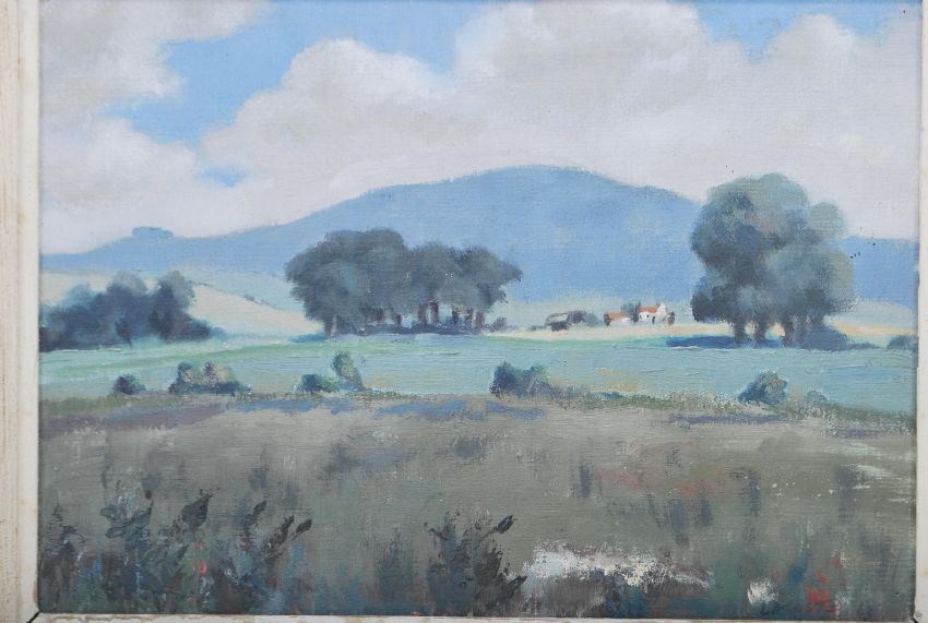 Gerald Lacoste - 'Litlington' - A mid 20th Century oil on canvas painting depicting a landscape scene with trees and buildings to the background. Signed and dated 1969. Framed.