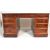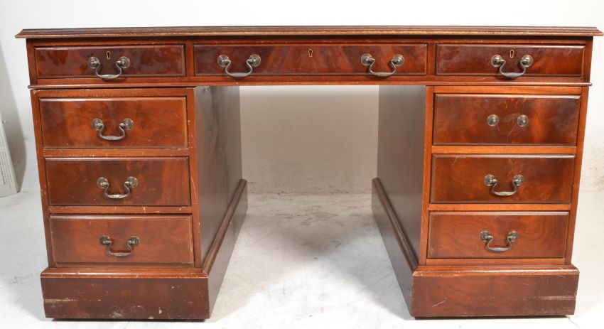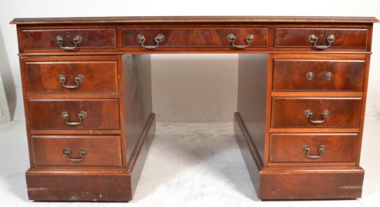 A Victorian style mahogany and leather twin pedestal Partners desk having tooled green leather inset to top, over twin pedestals each with two stacks of three drawers with single cupboard to each opposing side. Dismantles to 3 pieces for ease of movement