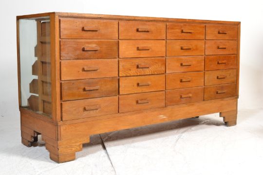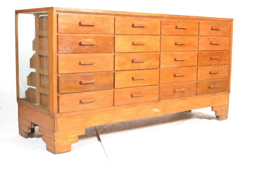 A good early 20th century 1930's Art Deco multi drawer vintage haberdashery shop display cabinet counter having fitted solid oak drawer fronts and handles, glass top and sides all being raised on stepped Art Deco block feet.  Measures 91cm high by 178cm wide by 59cm deep.