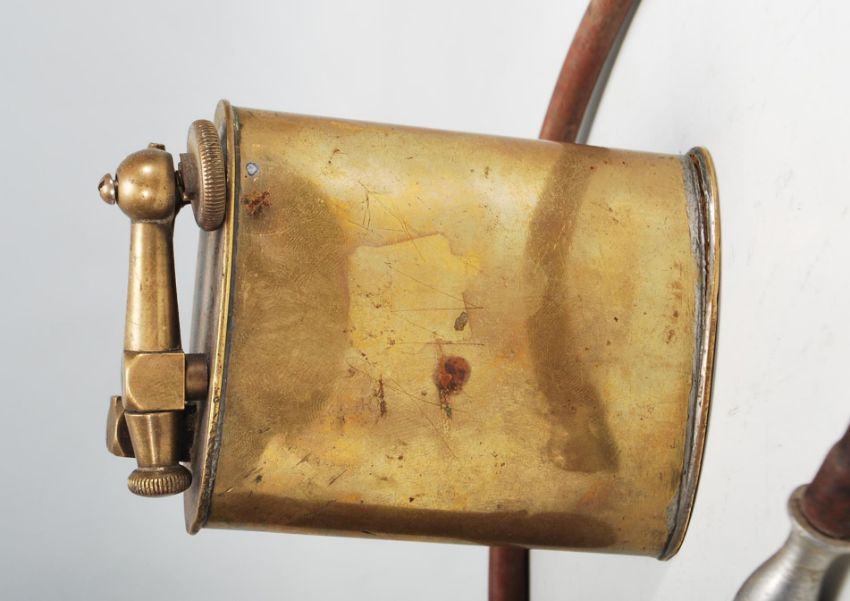 A small group of early 20th Century brass oil lamps / burners. One being French made 'Pigeon Lampe Merveilleuse for burning Benzoline, another of cylindrical form and the other oval. Biggest measures 18cm tall and 8cm in diameter.