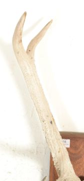 Taxidermy - A pair of vintage 20th Century white stag horns mounted on a oak wall plaque. Horns measures 59cm long. Measures 74cm high by 45cm wide by 35cm deep.