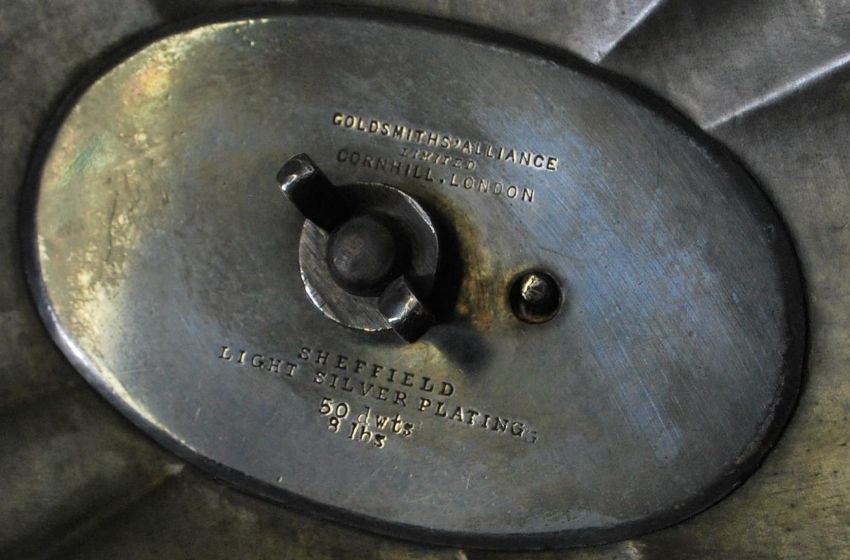 A large 19th Century silverplate on copper meat cover of simple form having a floral and scroll handle atop. Marks to inner for Goldsmiths' Alliance Limited Cornhill London Sheffield Light silver Plating. Measures 21cm tall by 35.5cm wide by 27cm deep..