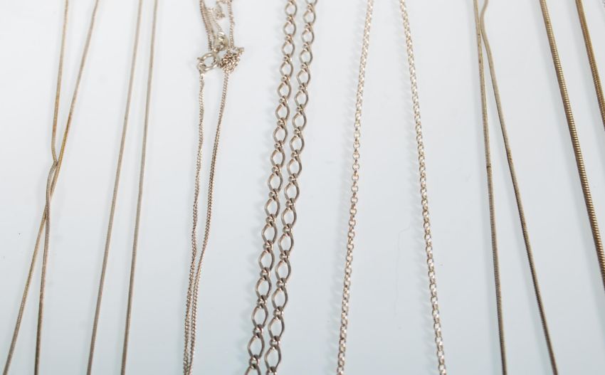 A selection of silver pendant necklaces to include a snake necklace with a wolf pendant medallion, a figaro chain with an ankh medallion, a C initial necklace, a floral pendant set with green stones, a box link chain with a pink glass pendant, an orb pedant set with blue stones, a stallion pendant set with coloured stones etc. All marked 925. Weight 64.1g.