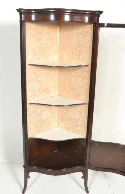 An Edwardian mahogany display cabinet, free standing and enclosed by a single serpentine shaped glazed panel door, revealing a shelved interior, raised on square tapered and slightly swept supports.  Measures 173cm high by 64cm wide by 42cm deep.