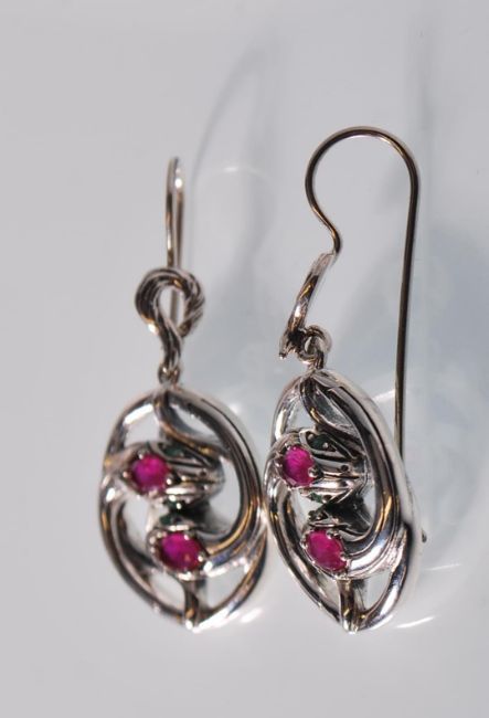 A pair of round snake like drop earrings having the centres moulded in to snake heads set with rubilite and green stone eyes. Stamped 925 to verso. Gross weight 13.1g. Measure 2cm diameter.