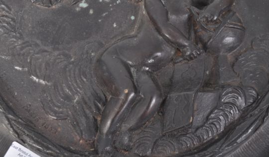 A 19th Century antique Grand Tour bronze plaque of oval form having relief decoration depicting Cherubs in flight among clouds. One holding wreaths with over led down and the lower example using a globe. Measures: 42cm x 32cm.
