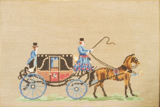 A pair of 19th Century embroideries of horse drawn carriages set to glazed rosewood frames. The left facing example with blue and black carriage and coachman with puce details the other similar with gent to rear of carriage. Measures: 37cm x 51cm.