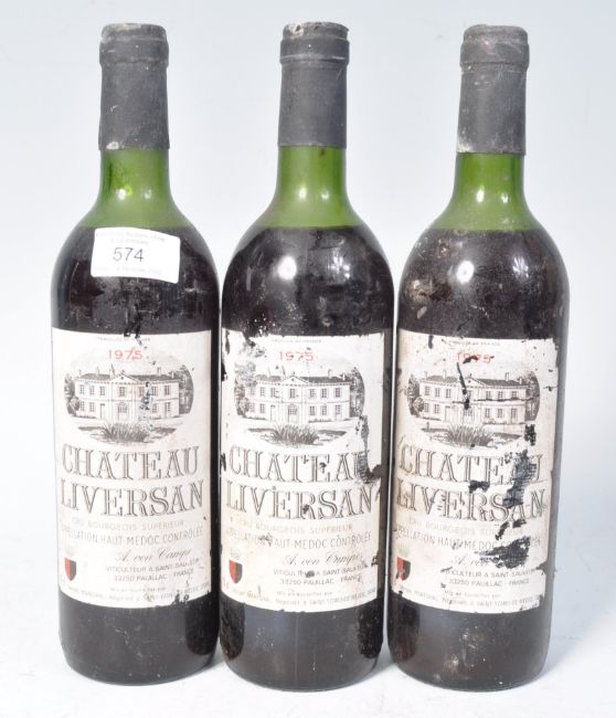 Three bottles of Chateau LIversan 1975 Appellation Haut Medoc Cru Bourgeois Superieur. 73cl