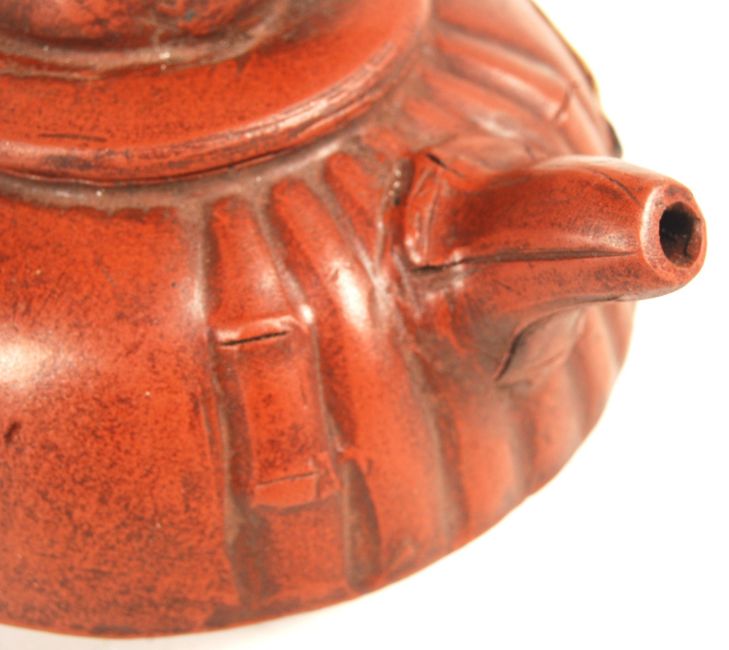 A 19th Century Chinese antique Yixing clay pottery teapot of squat form having faux bamboo decorated front and back with stylised leaves to sides. The lid featuring a seated water buffalo with character mark to underside of lid. Four character mark reign seal to underside. Measures: 8cm. Condition: No visible damage.