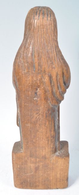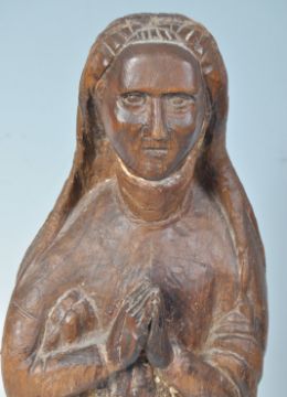 An antique 18th century antique limewood / lime wood carved religious figure of Mary. Mary with hands together in prayer, standing on a squared base with a carved cherub to the base. Remnants of original paint fragments to one side. Measures approx; 48cm.