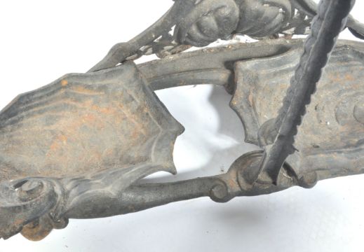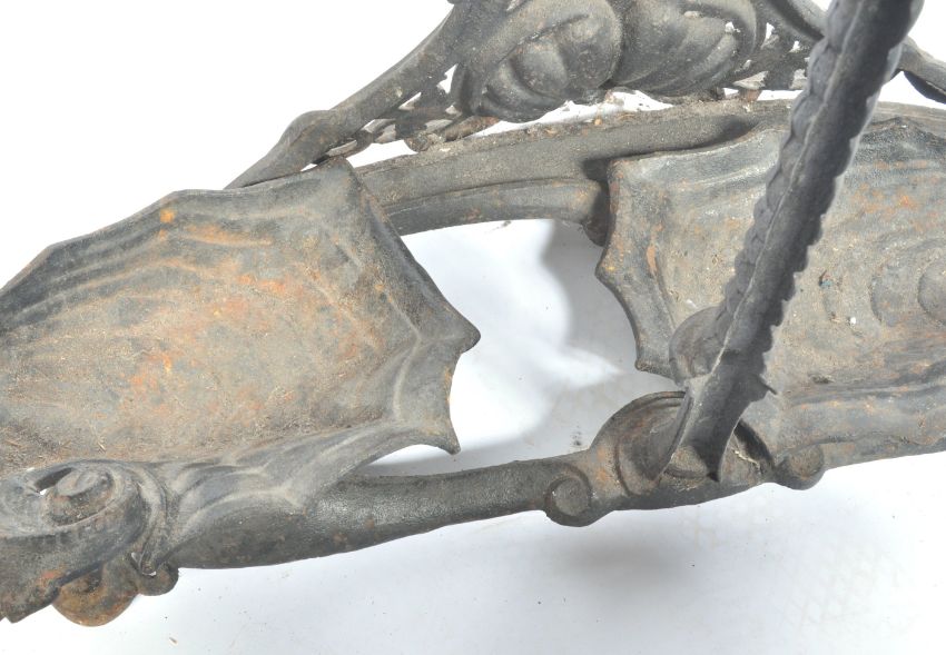 A 19th Century Victorian cast iron Coalbrookdale manner stick and umbrella stand having a shaped stick stand top with five reedes sections raised on pierced decorated column over twin shell shaped tray base. Victorian date lozenge present. Measures: 16cm x 65cm.