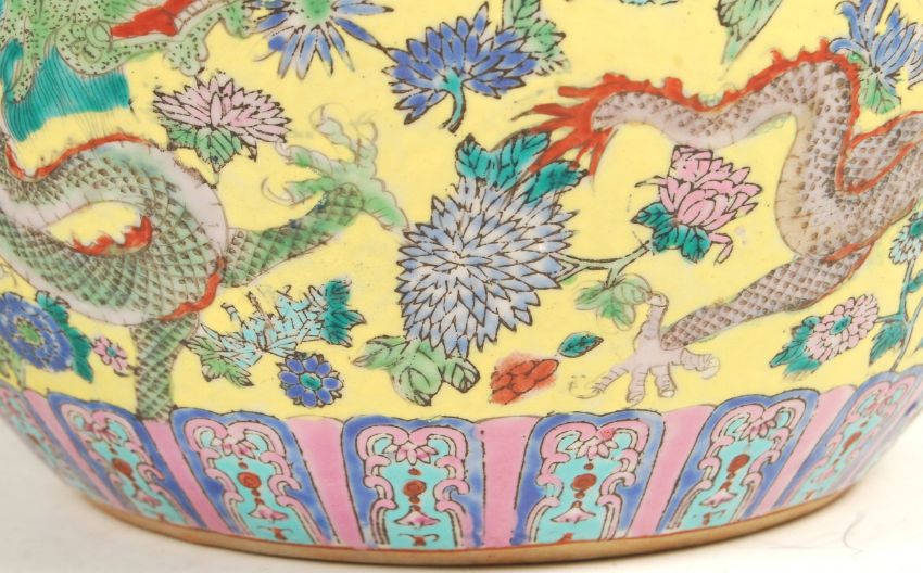 An early 20th Century Chinese Republic Period porcelain planter of large form. Famille Jaune ground with hand painted scenes depicting dragons and flowers. Turquoise border to top with decorated detailing to lower section. Measures: 23cm x 25cm.Condition: No visible damage.