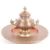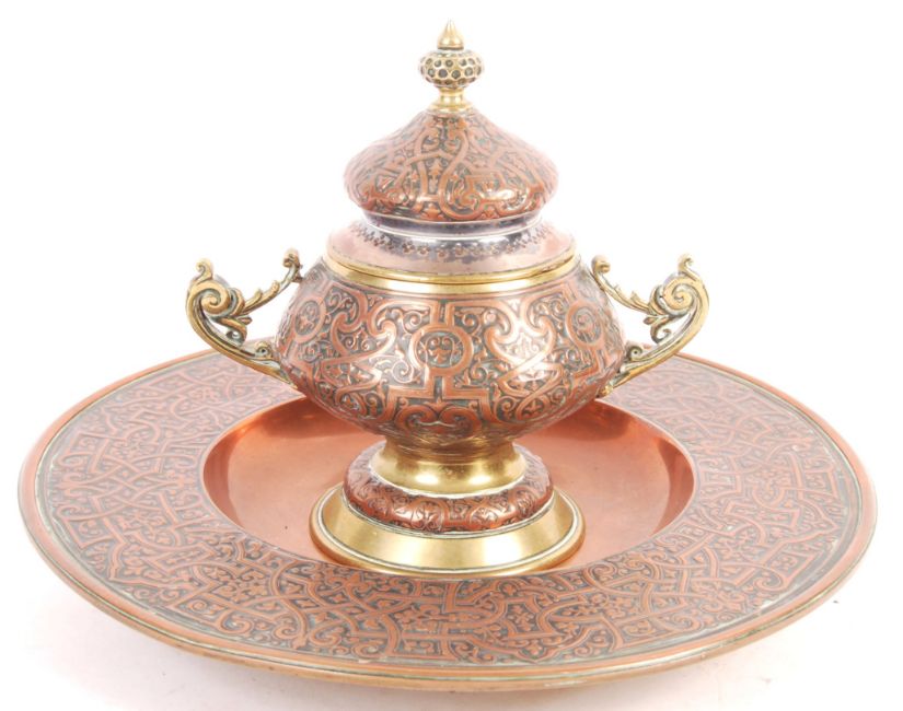 A 19th Century Islamic Persian Middle Eastern antique copper and brass inkwell with matching stand tray. The inkwell having twin brass scroll handles with urn finial lid and stepped circular base. Profuelsey decorated with repousse and chasing. The circular tray of matching form and design with central well and base for inkwell. Measures: 25cm wide (stand)Condition: Good overall with no visible dents. One screw / bolt missing from handle. Hing on inkwell is broken.
