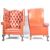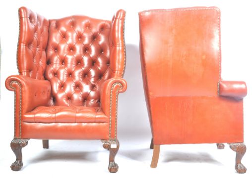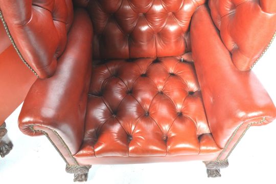 A stunning pair of 20th Century  Queen Anne manner high back Chesterfield wingback fireside gentlemans club armchairs having oxblood red leather button back, side and down seat with brass studded borders. Raised on carved scroll acanthus ball and claw feet. Measures: