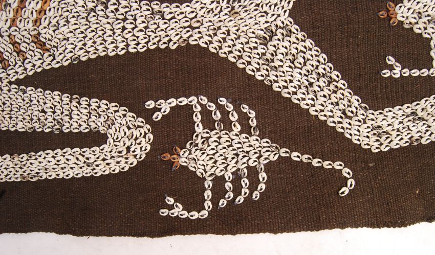 A mid 20th Century African art shell beaded cloth having horned demonic figure with three scorpions to feet. The cloth having tasselled edges. Measures; 86cm long.