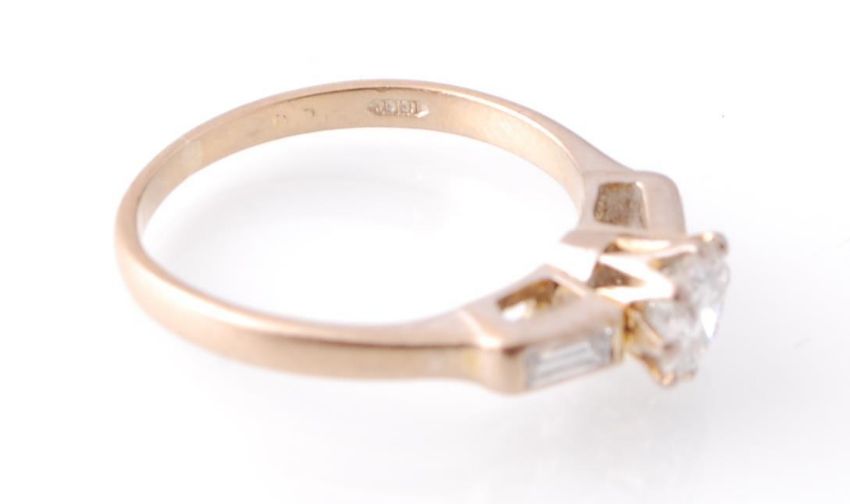 An 18ct gold and diamond ring. The ring set with a central round brilliant cut diamond flanked by two diamond baguettes. Central diamond approx 0.44ct Import marks for London.Weight 2.4g. Size K.5.