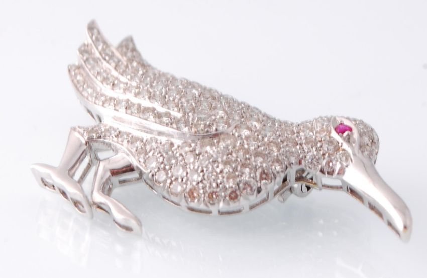 A French 18ct White gold ruby and diamond bird brooch. The brooch in the form of a sea bird having a pavé set diamond body and a ruby set eye. Completed with roller clip clasp. Estimated diamond weight 2.5cts. French eagle assay mark to body.  Measures approx 2inches. Weight 10.3g.