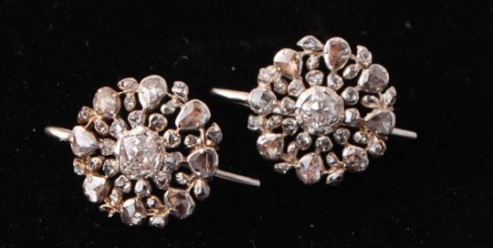 A pair of 19th century diamond cluster drop earrings. The earrings being strung with large openwork diamond clusters, having a central old cut diamond. The principle diamond surrounded by a further two foliate inspired halos, including round and pear shaped rose cut diamonds, most bezel set. Un marked tests indicate silver. Total weight 4.1g