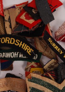 A good large collection of assorted original WWII Second World War British Army uniform cloth patches. Includes; Parachute Regiment, Wiltshire Regiment, Women's Royal Army Corps, Royal Natal Carbineers, Royal Engineers, Free French Forces, Staffordshire Regiment and many others, as well as stripes and pips. Interesting collection.