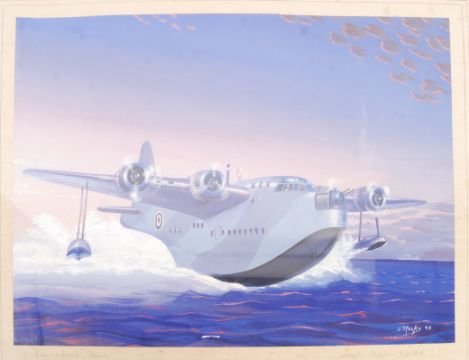 Joseph Stocks - 20th century - Royal Academy - a good WWII Second World War related oil on board / card painting ' Sunderland Dawn ' of a WWII Sunderland Coastal Command plane making a water landing, at dawn. Dated 1943 and signed to corner. Framed and glazed. Total size; 53cm x 65cm.