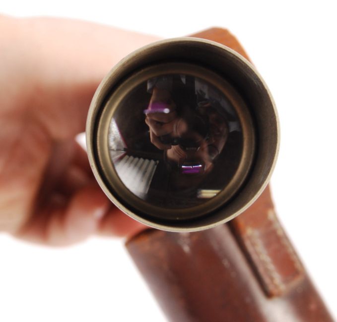 A WWI First World War single draw brass spotting ' Tel. Marine MkII ' trench telescope by H. C. Ryland & Sons Ltd, London. Makers marks to eyepiece, with broad arrow. Leather covered body, with detachable lens cap. Measures approx 60cm total length.