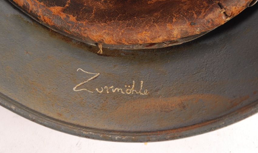 A rare original WWII Second World War Third Reich Nazi German army issue Stahlhelm M35 steel combat helmet. Double decal Luftwaffe version. Complete with original liner and chin strap. Impressed numbers to rim ' 128 ' (partially illegible). Named by soldier to rear rim ' Zurmohle '. Rare original example.