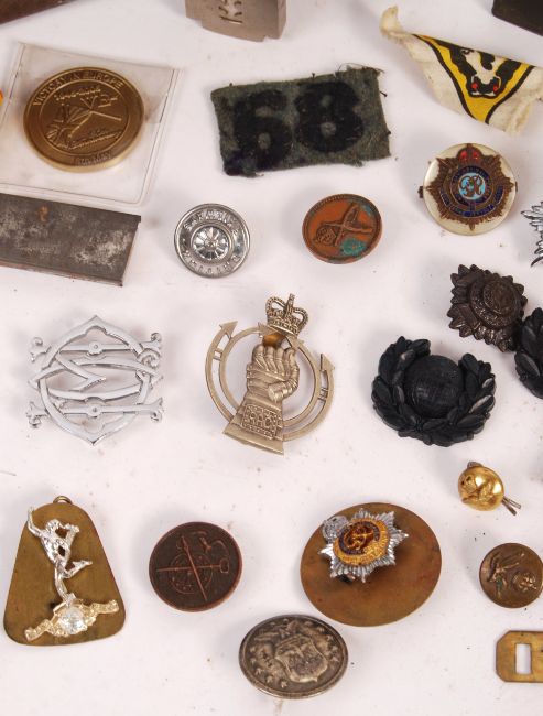An assorted collection of assorted WWII Second World War (and later) buttons, badges and cloth patches. All housed within an original WWII 1943 dated ammunition tin. Contents include; Suffolk Regiment cap badge, RASC cap badge, miniature hip flask, and other items.