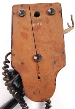 A WWI First World War era wooden cased telephone - similar to those used in some British trenches during the period. Wooden cased, with ' Listen Before Ringing Code ' plaque to front. Bell mounted beneath, with a bakelite handset. Rare.