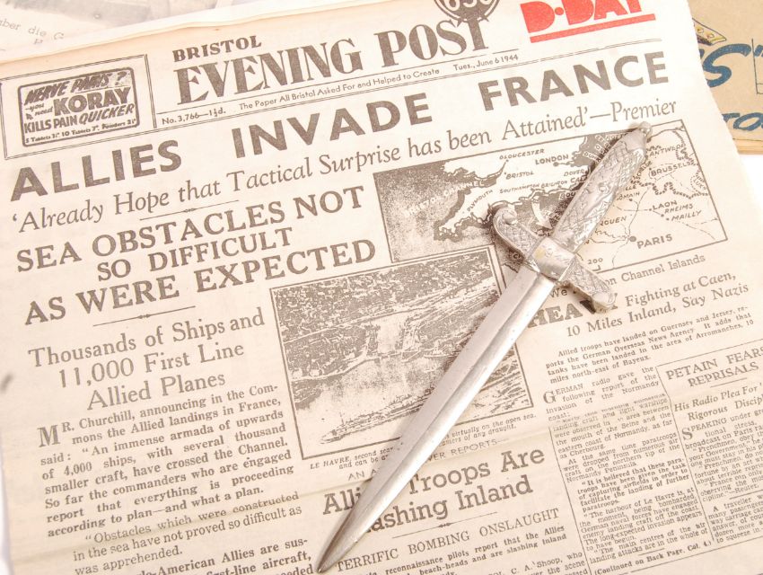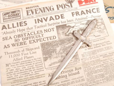 An interesting collection of assorted WWII Second World War ephemera and items, to include; an original Special Order of the Day from Field Marshal Alexander 1945 letter, a leaflet showing the ' German Military Underground Hospital - Jersey', a ' German Army In Pictures - Not To Be Published ' recognition book, a 1944 dated letter opener, an air-dropped German Propaganda leaflet, and some local Bristol Evening Post reprinted newspapers. Interesting collection.