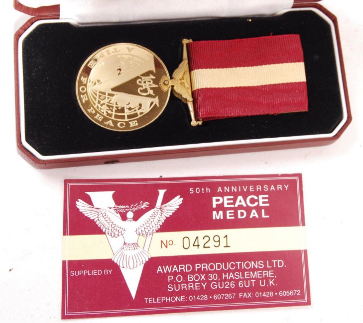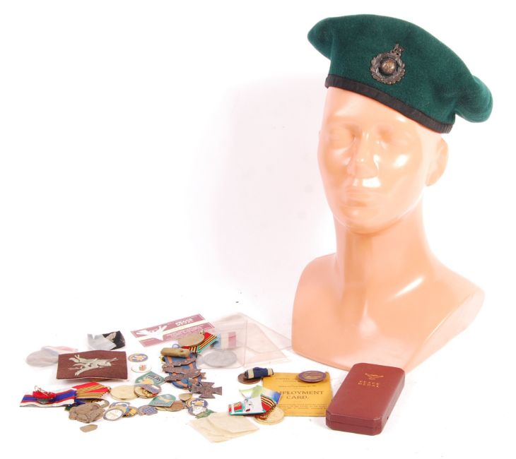 A collection of assorted conflict 20th century badges, medals and a Royal Marines beret (with badge). The beret made by Compton Webb Ltd. Lot also includes a 1945 Peace Medal in box, Cheshire Education Committee badge and card, combat patches, medal ribbons etc. Interesting assortment.