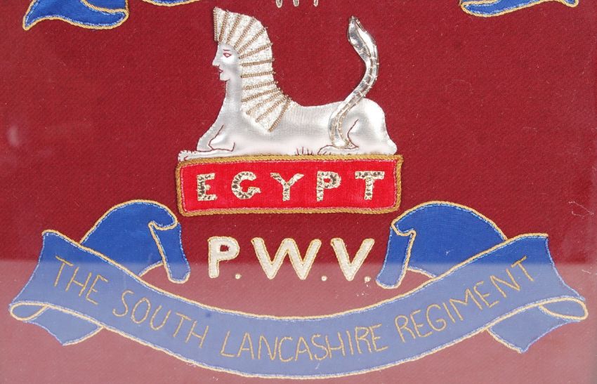 A post WWII Second World War British Military framed and glazed bullion ware embroidered emblem for the The South Lancashire Regiment. Measures; 40cm x 32cm.