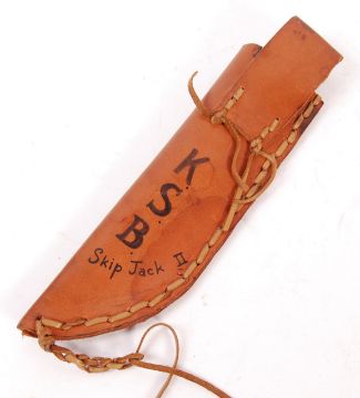 An unusual original WWII Second World War period bowie / combat knife leather scabbard. Marked for the ' 1st Division / 6th Division - Combined Operations - Durham Light Infantry - 3rd Battalion - 131 Flotilla ' to front and 'KSB Skip Jack II ' to rear. Knife not present. Interestingly decorated scabbard. Measures approx 24cm.