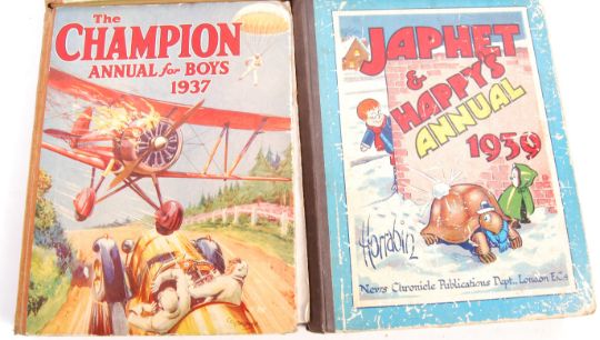 A rare collection of British WWII Second World War wartime published Children's / Boys annuals. Very few ever produced during the war for shortages reasons. Includes a 1939 copy of Japhet & Happy's Annual, a pre-War Champion Annual For Boys 1937, an ' Our Girls Gift Book ', and a 1940's Japhet & Happy's annual. Rare.